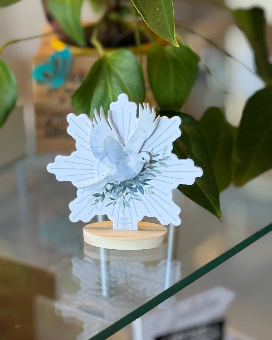 Enfeite de mesa com a pomba do Espírito Santo em relevo e frases inspiradoras para abençoar e proteger seu espaço.